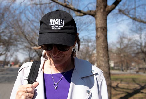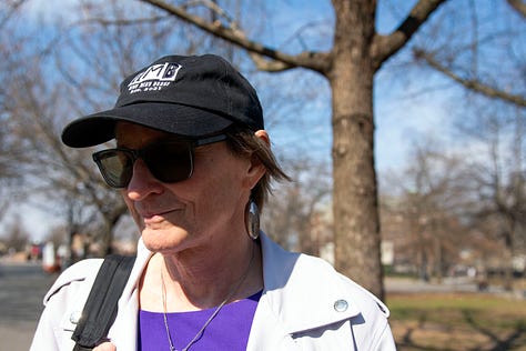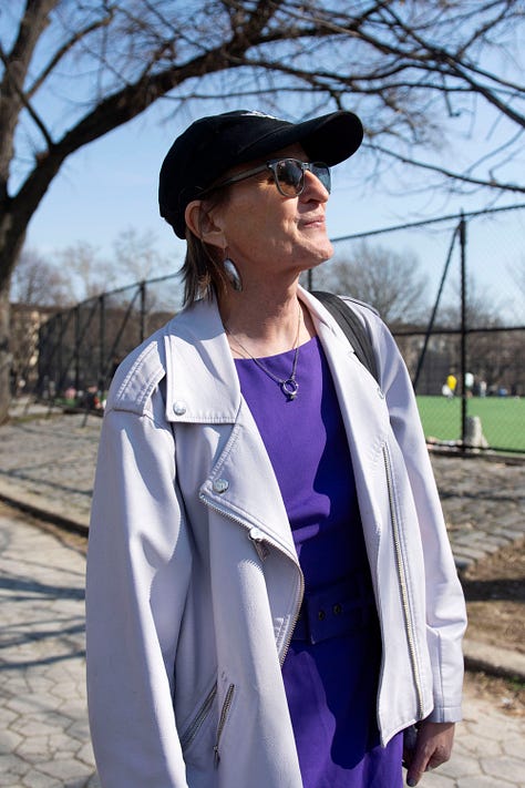 Outside, the sky is cloudless, the sun bright. It’s the kind of day you ache for as winter shoves itself off the face of the city for a few months. McKenzie wraps a pale lavender motorcycle jacket around her arms, adds a Hive Mind Books baseball cap, and we head to Maria Hernandez Park nearby.