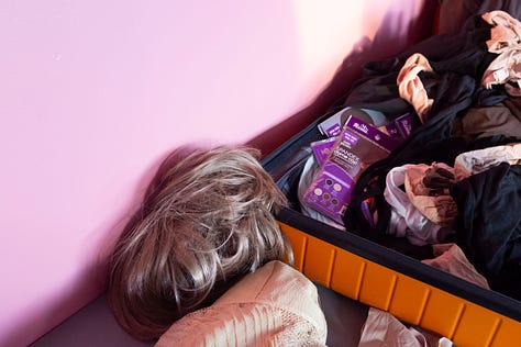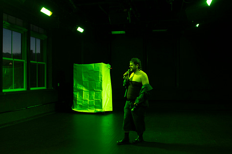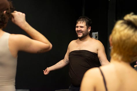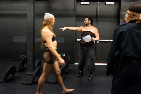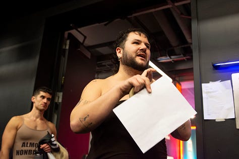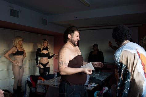 Even backstage, these qualities start to reveal themselves, as TRSA directs her cast, many of them denizens of drag and nightlife themselves, into wig caps, bungee cords, blazers, and singlets. Downstairs in one of PSNY’s black box spaces, she runs them through the show, where they’ll enter, where they’ll get their microphones. She places the run of the show by the door.