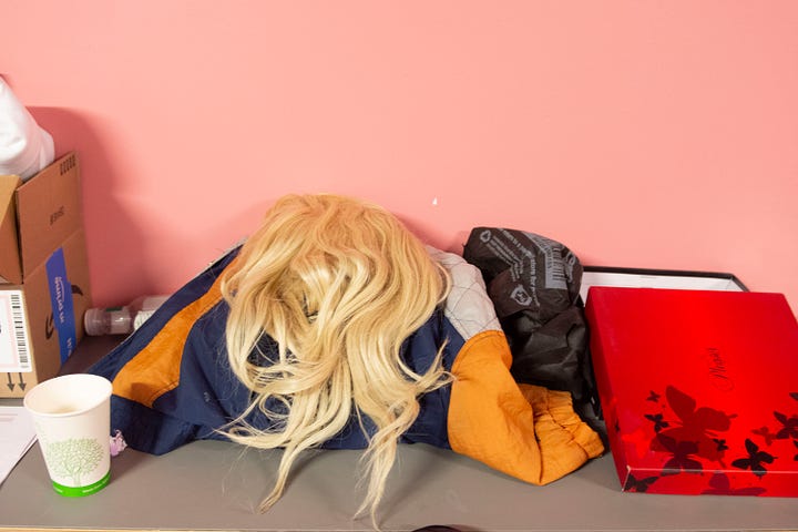 In a dressing room at Performance Space New York, MTHR TRSA is brushing a wig as bodies twist themselves into a host of pantyhose, spandex, and ALMOST NONBINARY t-shirts (yes, you can buy them–here, along with her ACTIVELY EATING shirts). Today, in about two hours, she’ll be debuting her performance piece High and Scared, an experimental work in progress, the title of which she also has tattooed on her back in stick-and-poke script. Until showtime, wigs need fluffing, costumes need adjusting, lighting cues need organizing. It’s a periodic dash up and downstairs.