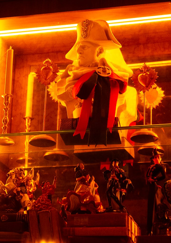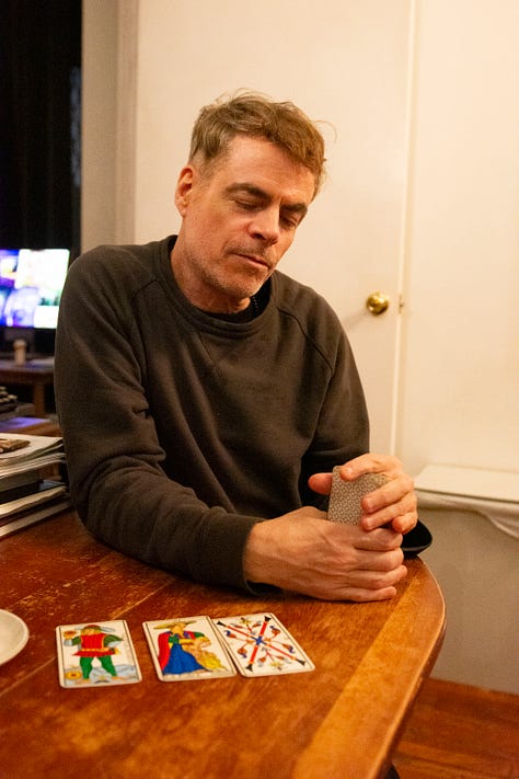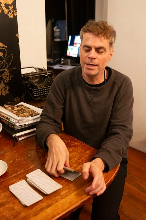 Before we do anything else, Rob Roth reads my tarot cards. We cut the deck once, twice, three times sitting at his dining room table. Sprinkled across it are a red tile from a Valentino show in Paris, a white elephant teapot, some partly burnt palo santo sticks in a white ashtray. Above us hangs a chandelier dripping with juicy, clear baubles. The walls are papered with a print of gold surveillance cameras edged in flowers on black paper. He’s drawn The Fool countless times from the tarot deck, he says, and though tonight it’s swords. For me, it’s La Force.