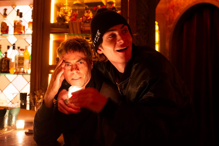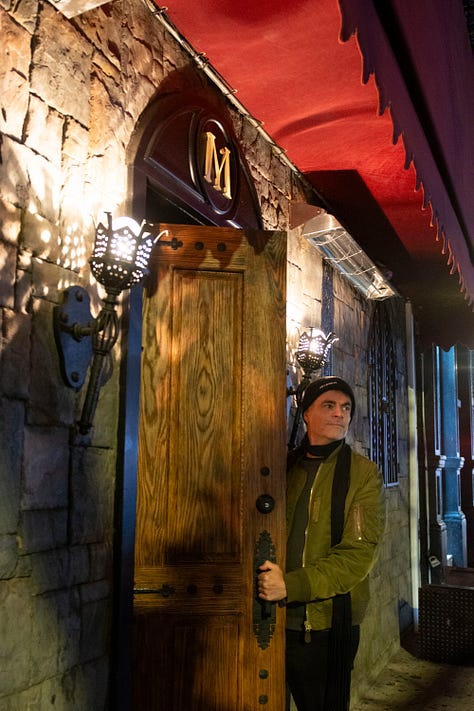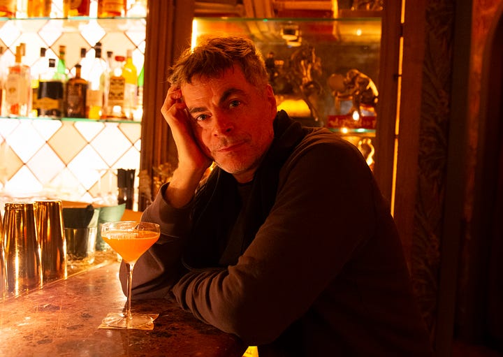 We arrive next at the newish bar Monsieur, owned by director Baz Luhrmann. Inside, the light is amber, the bar is curling, the mirror behind the bar is like stained glass, and paper of dark leaves lines the walls–almost like if the Beverly Hills Hotel’s Fountain Room only went out at night/was a vampire. We sit at the bar and sip cocktails, fruity and smooth, from long-stemmed coupe glasses. Rob has become a regular, and chats breezily with the team. He is a natural in this light.