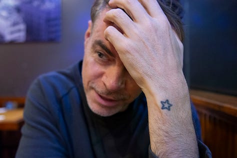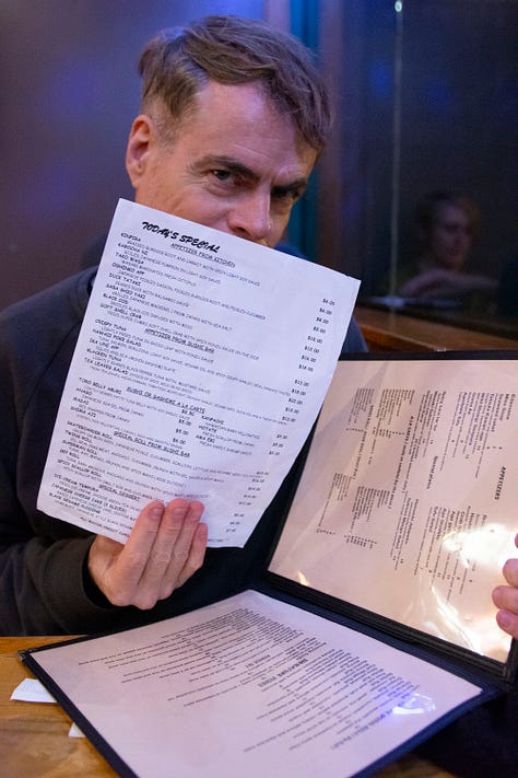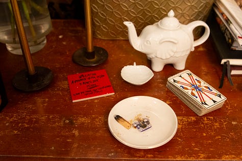 Once we finish tarot, he puts on a pair of gold and black leopard sneakers and we are off into the night. He wants to show me some of his favorite murals of ripped posters on the Lower East Side, those wheatpasted ads piled on top of each other then ripped apart. It’s unintentionally art, he says. He moves us up Essex Street to a beloved neighborhood Japanese joint, Takahachi. Rob is greeted with warm waves and hellos. I notice a star tattoo on his wrist, but I forget to ask the story. We nibble on sushi and conversation is easy–Rob is chatty and impish; his eyes flash when he talks about ideas for the future and stories from the past. Rob also wants to make sure I see the bathroom–it’s yellow and decked out in graffiti. There’s a theme here, of art in unexpected places.
