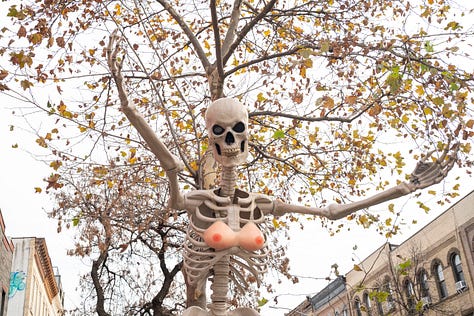 Given Zac’s relationship to their own community as a photographer, it’s maybe not surprising that they would be embedded in their neighborhood, too. We meet at their building, walking past a mural of swirled pastels and a surfing teddy bear (which they detest). Passing a bar called Boobie Trap, a massive skeleton wearing a breast plate greets us with open arms. We amble on to Hive Mind Books, “a queer-owned independent bookstore stocking Brooklyn’s largest selection of books by queer and trans writers.” Zac tells me Frankenstein is the only book they’ve read three times, curious about its relationship to queer and trans worldbuilding. They purchase an iced coffee from the owner, Julie, who’s behind the counter.