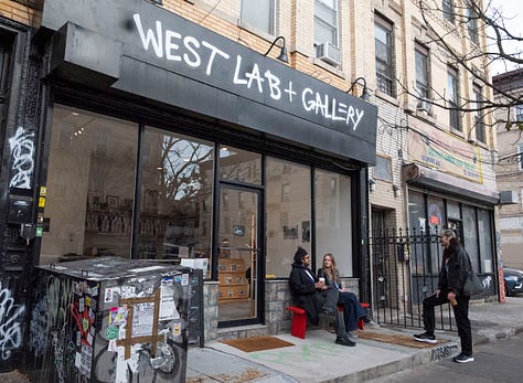 The next stop is Westlab + Gallery, where Zac regularly purchases and develops disposable cameras and film. Outside when we arrive, proprietors Shrey and Jacquey sit bundled in coats sipping coffee. Zac stays awhile and chats, then pops inside for more rolls of film, admiring the work on the walls.