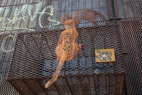 We loop through Maria Hernandez Park, where someone flies a model airplane through the sky as a real airplane passes over us. Trees bright with autumn leaves press against grey clouds. One particular street leads us past cat sculptures and an explosion of murals, ones much better than the surfing bear.